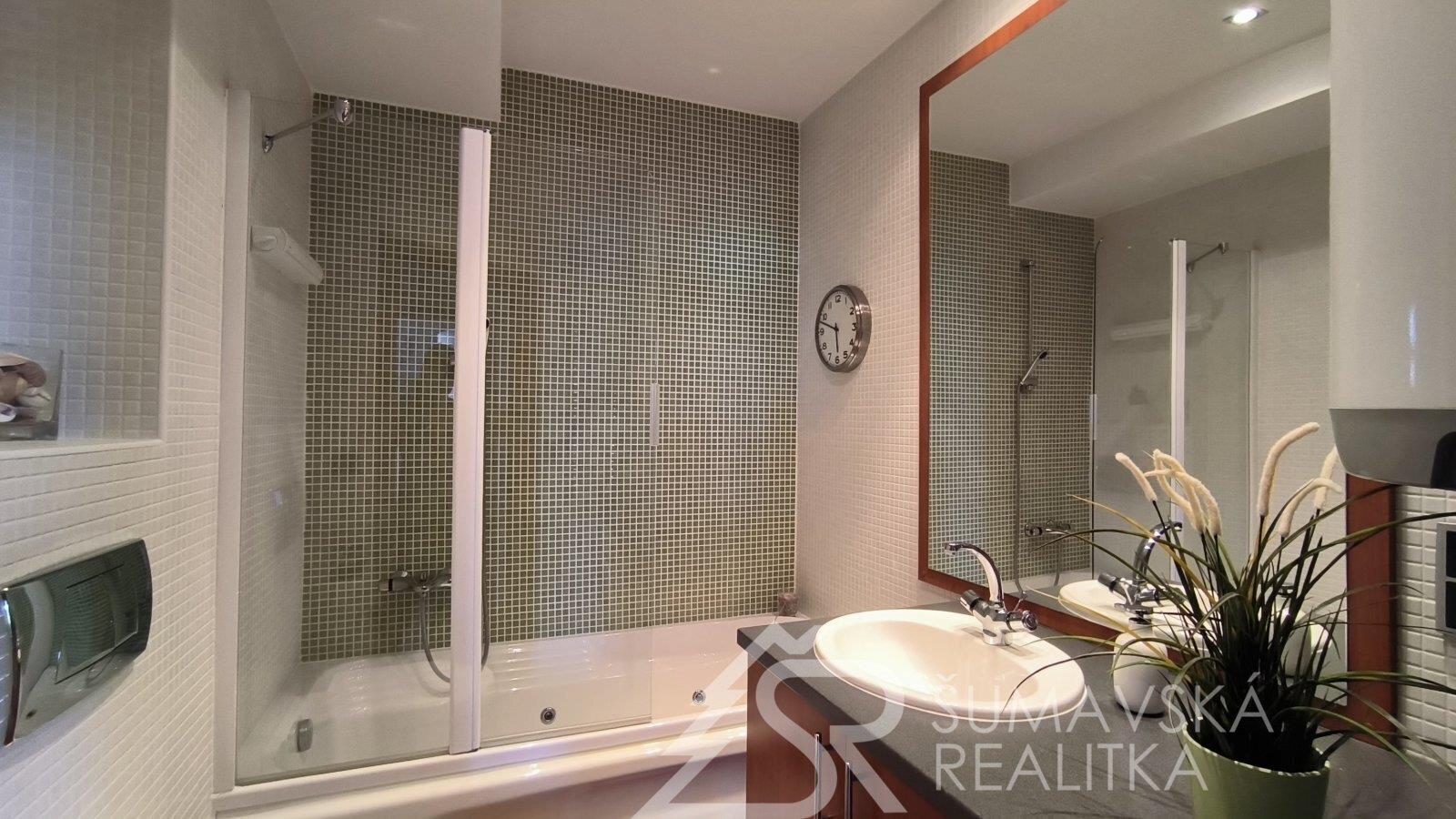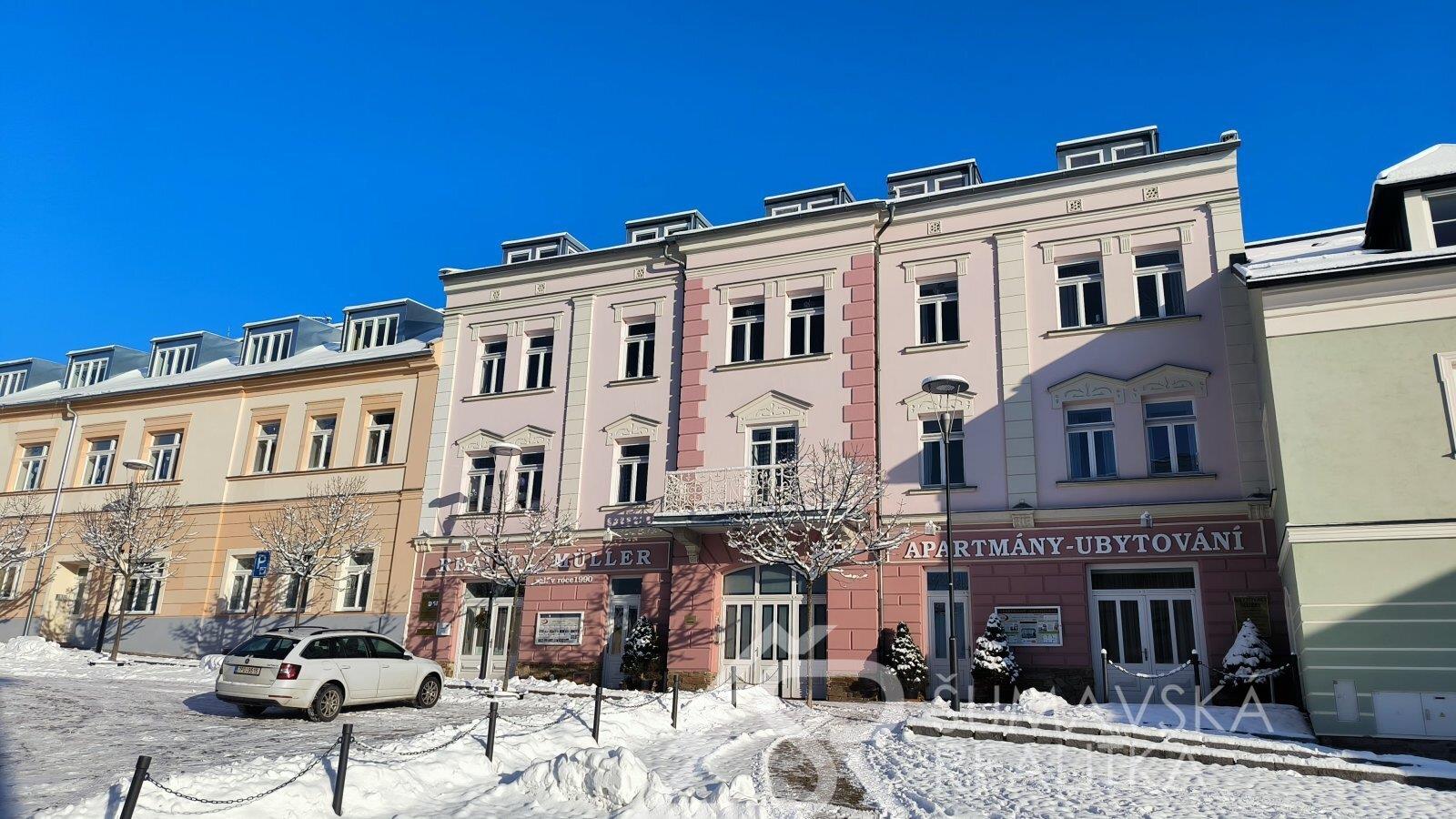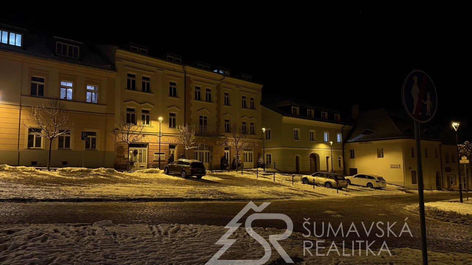 Přímo na gotickém náměstí v Kašperských Horách se nachází zrekonstruovaný dům v jehož 2.NP je nabízený apartmán o podlahové ploše 120 m2, který vznikl spojením dvou sousedních bytů. Nádherný výhled na námětí s kostelem sv.Markéty a radnicí je opravdu nezapomenutelný a neokoukatelný. Byt prošel kompletní modernizací v roce 2020, je nadčasově designově zařízen a v tomto stavu se také prodává. V prostorné předsíni jsou velkorysé vestavěné zrcadlové skříně a vstupy dveřmi z masivu do třech ložnic, obývacího pokoje, kuchyně s jídelnou a dvou koupelen s mramorovým obkladem. Ve větší ložnici je umístěna i infrasauna. Na jedné stěně v kuchyni je zachovalé původní kamenné zdivo, které dodává místnosti punc historie. Vybavení však hovoří o moderní době, kdy zařizovací předměty jsou od firmy Siemens (sklokeramický sporák, vestavěná trouba, digestoř) a myčka Bosch. Krásné jsou i dřevěné kryty radiátorů a velkoformátové dřevěné parkety z teaku v obytných místnostech. Veškerý nábytek byl tvořen na míru. V jedné z koupelen je vířivá vana a bidet. K bytu jsou k dispozici na chodbě dvě samostatné praktické komory a ve vnitřním dvoře parkovací stání.