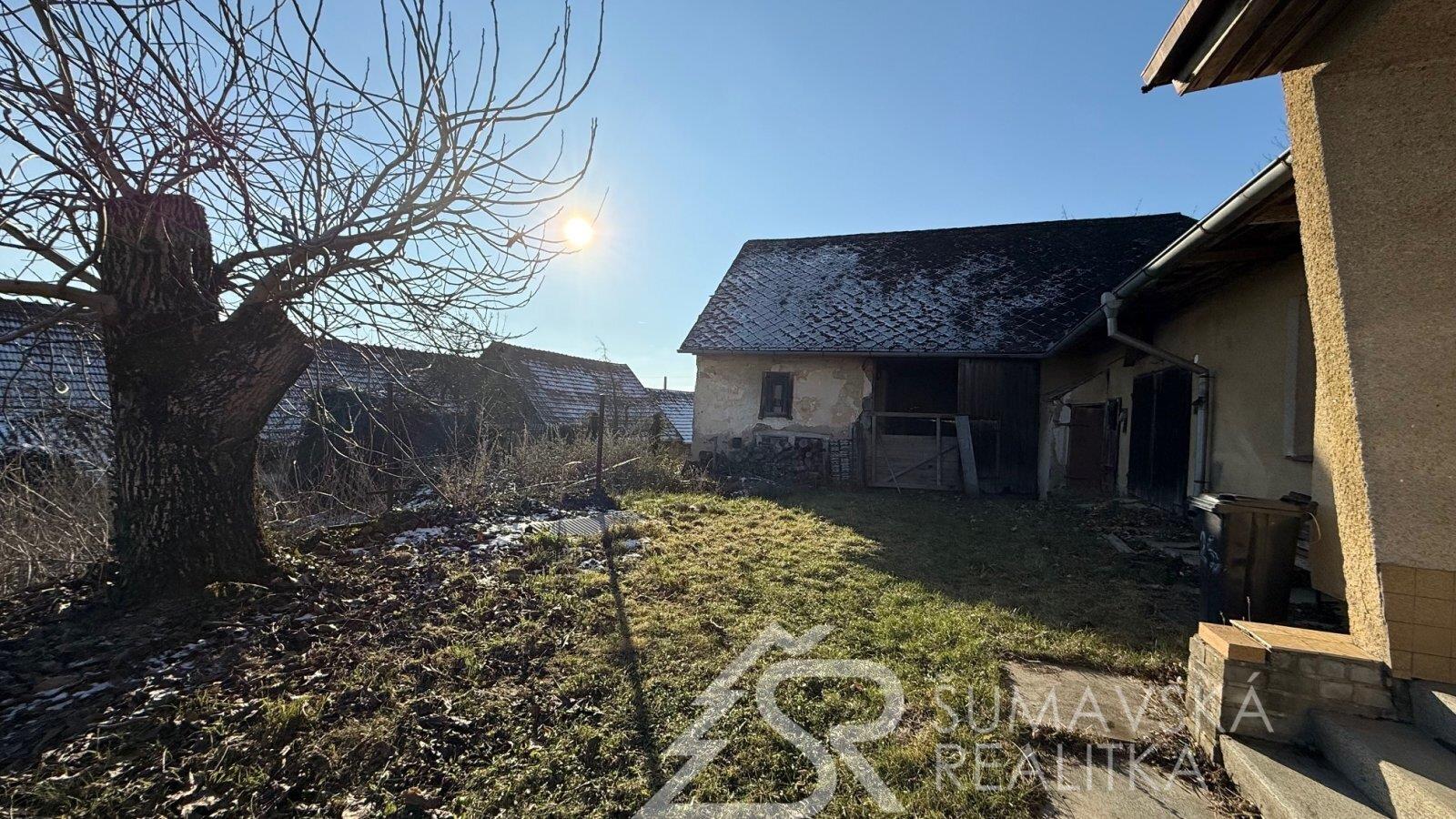 Na obytnou část navazuje garáž s umístěným starším, avšak funkčním kotlem, a také prostorná stodola, která nabízí další úložné či dílenské zázemí.