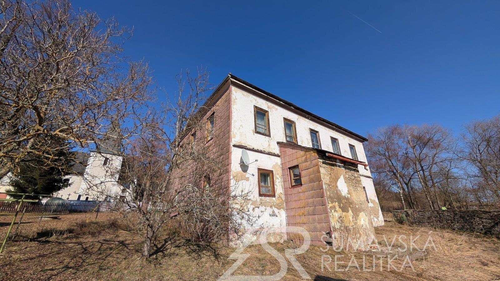 Popis: jedná se o původní bytelně stavěnou školu, ještě z předválečného období. Velké a světlé místnosti také poté sloužily jako místní malé kino. Pak byl dům přestavěn na rodinné bydlení, ale jeho údržba vázla a nyní je ve stavu vhodném k rekonstrukci. Nabízí se krásné rezidenční bydlení pro větší rodinu s dostatečným pozemkem, nebo se pokusit dům přestavět na bytový dům o šesti apartmánech –dva na každém patře. Tato varianta je vhodná pro menší developerský projekt.