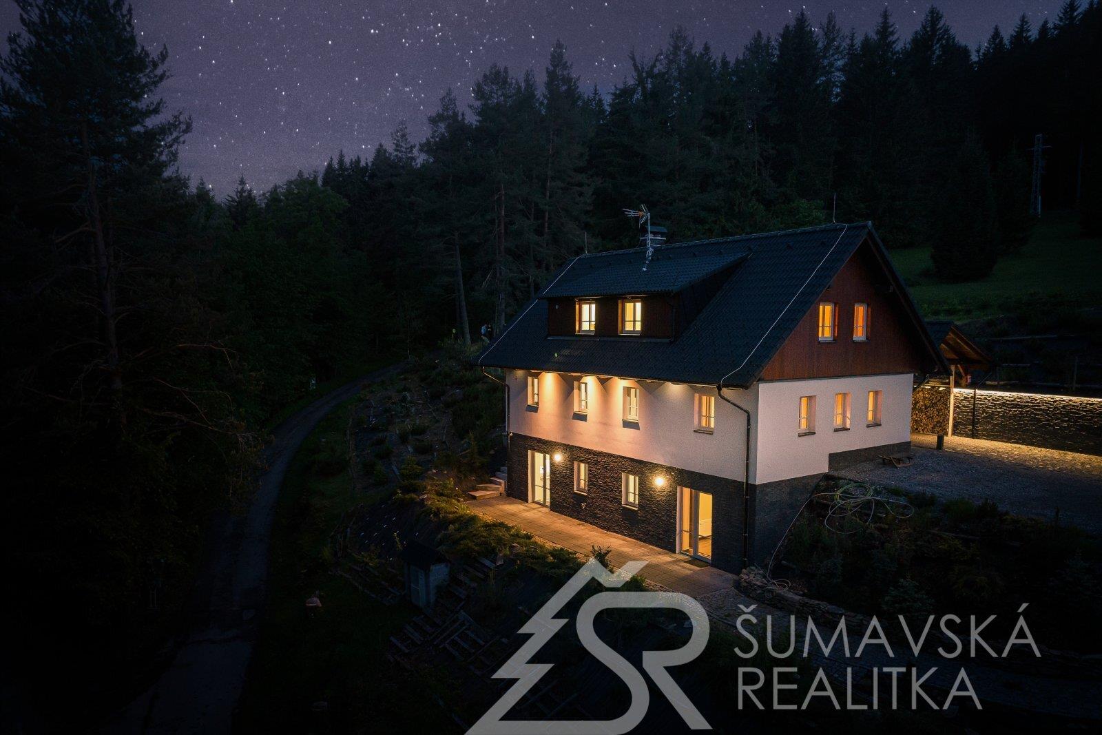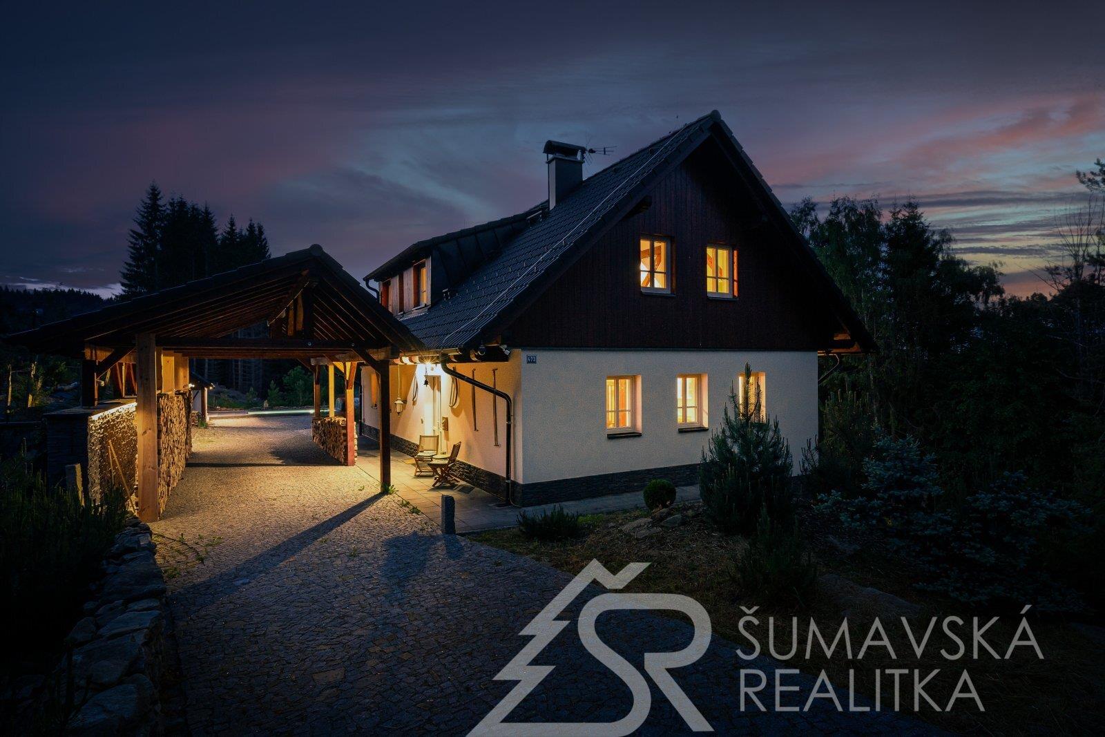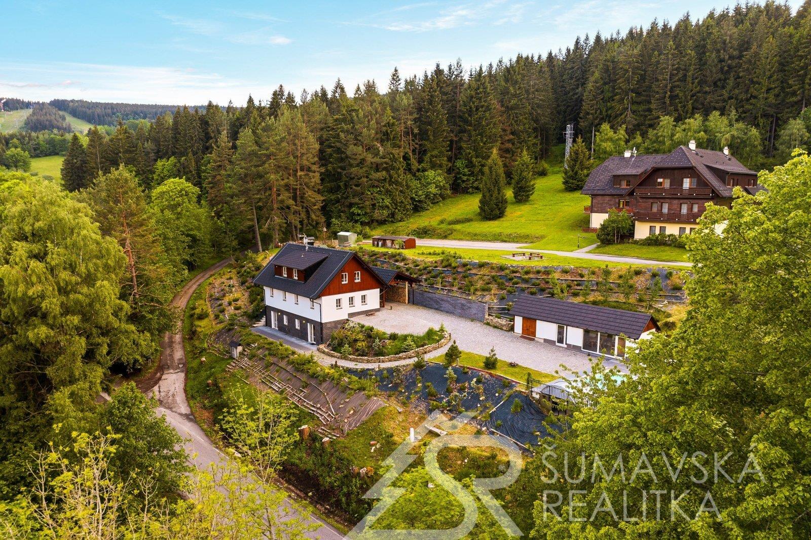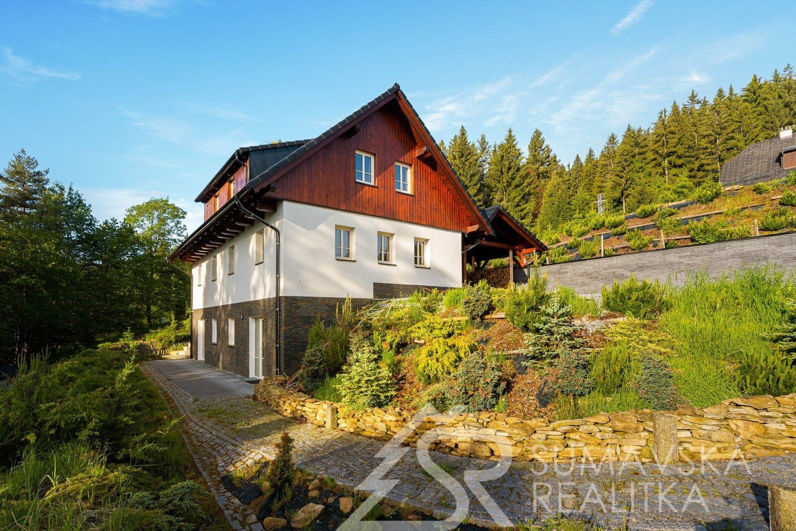 Popis domu: Nadstandardní stylový dům alpského typu, v němž se nachází tři samostatné luxusní bytové jednotky, je novostavbou na obdélníkovém půdorysu o velikosti 8,0 x 14,0 m. Usazen je v mírném svahu, na krásném, klidném – i v zimě dobře dostupném místě. Exteriér domu přiznává prvky původní šumavské architektury a má velmi příjemné barevné vyladění exteriéru – takže souzní s krajinou a působí přívětivě již při příjezdu. Součástí je i venkovní krytý a zastřešený bazén o rozměrech 8 x 3 x 1,2 m. Dále venkovní finská sauna s posezením v samostatném domku.