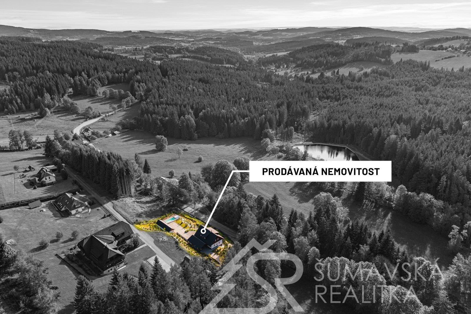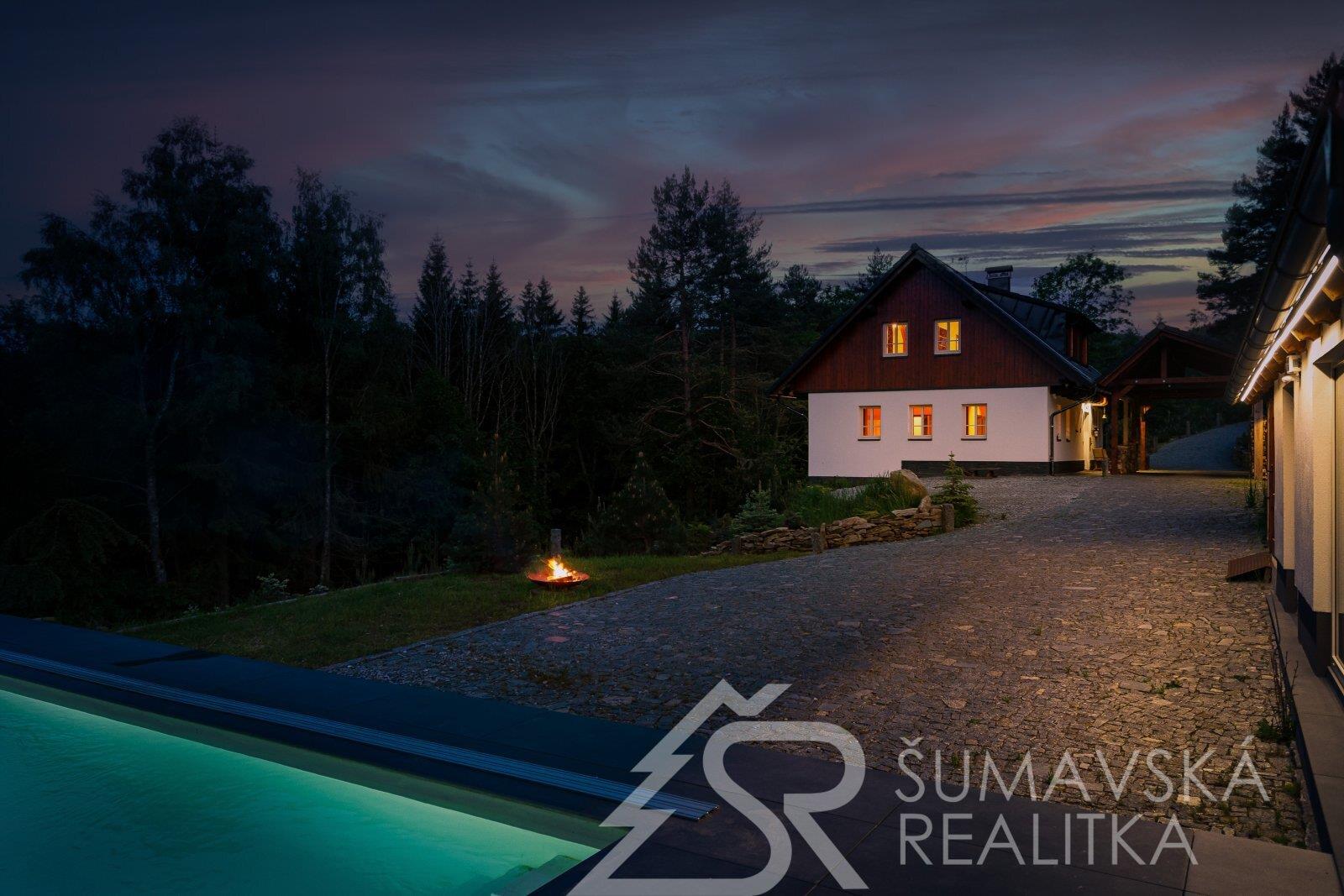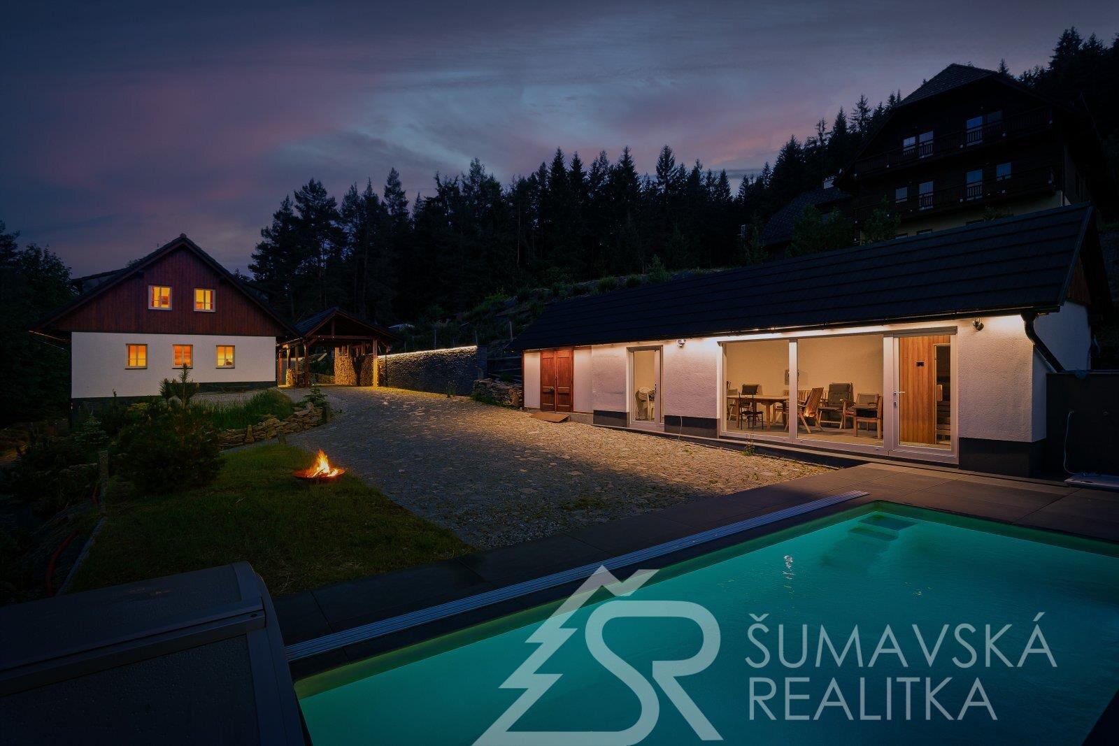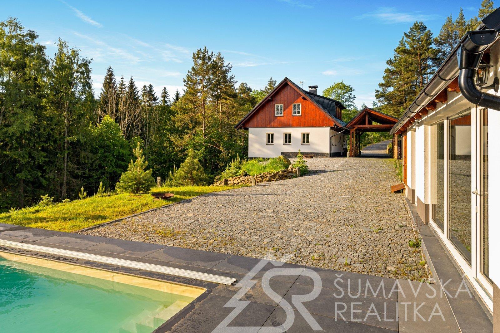 Popis domu: Nadstandardní stylový dům alpského typu, v němž se nachází tři samostatné luxusní bytové jednotky, je novostavbou na obdélníkovém půdorysu o velikosti 8,0 x 14,0 m. Usazen je v mírném svahu, na krásném, klidném – i v zimě dobře dostupném místě. Exteriér domu přiznává prvky původní šumavské architektury a má velmi příjemné barevné vyladění exteriéru – takže souzní s krajinou a působí přívětivě již při příjezdu. Součástí je i venkovní krytý a zastřešený bazén o rozměrech 8 x 3 x 1,2 m. Dále venkovní finská sauna s posezením v samostatném domku.