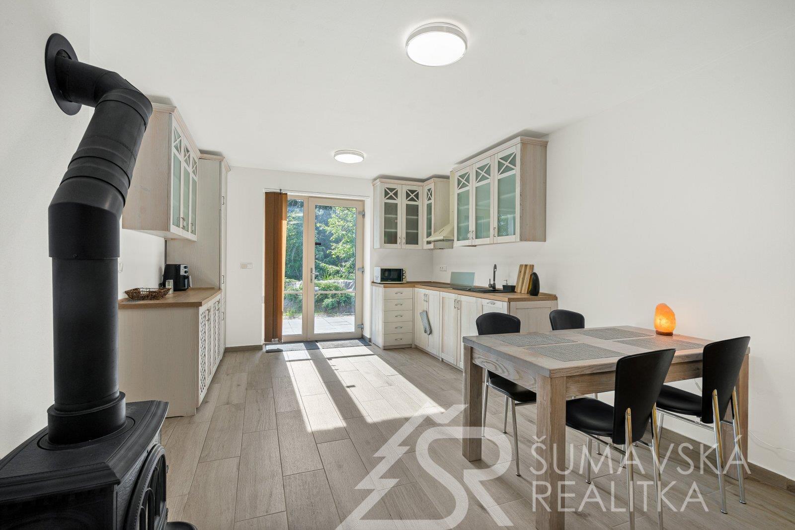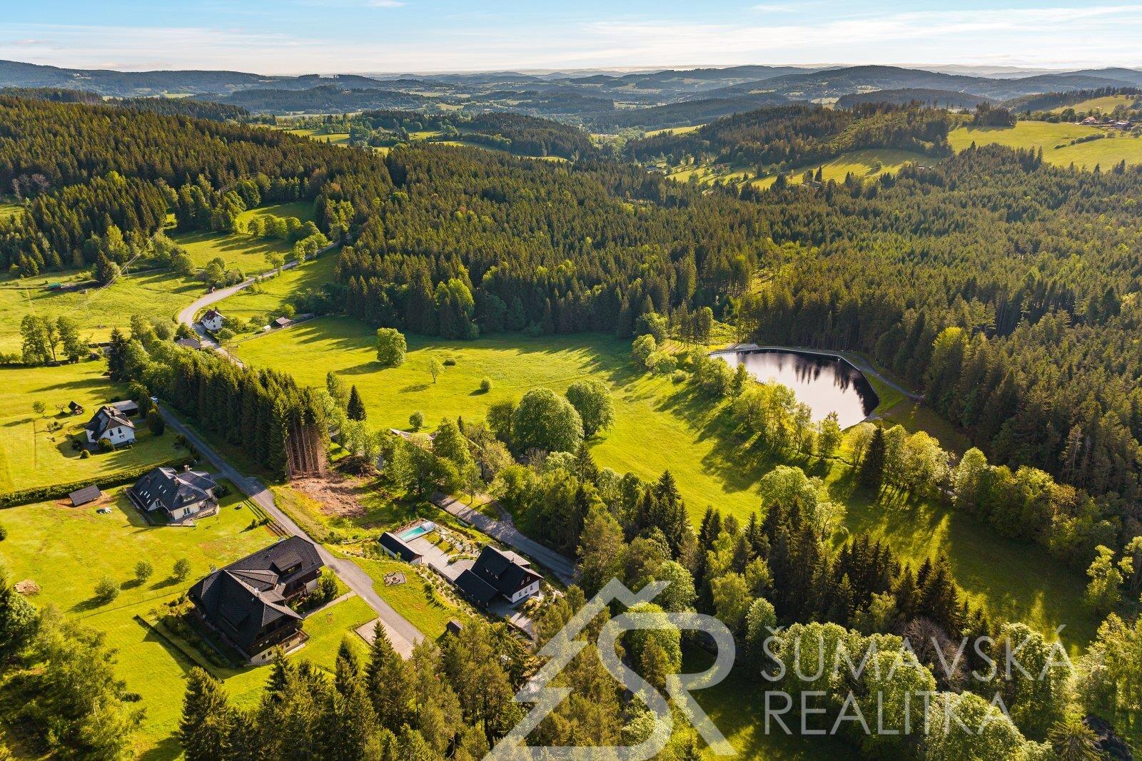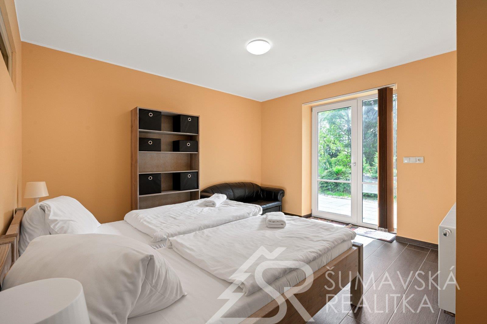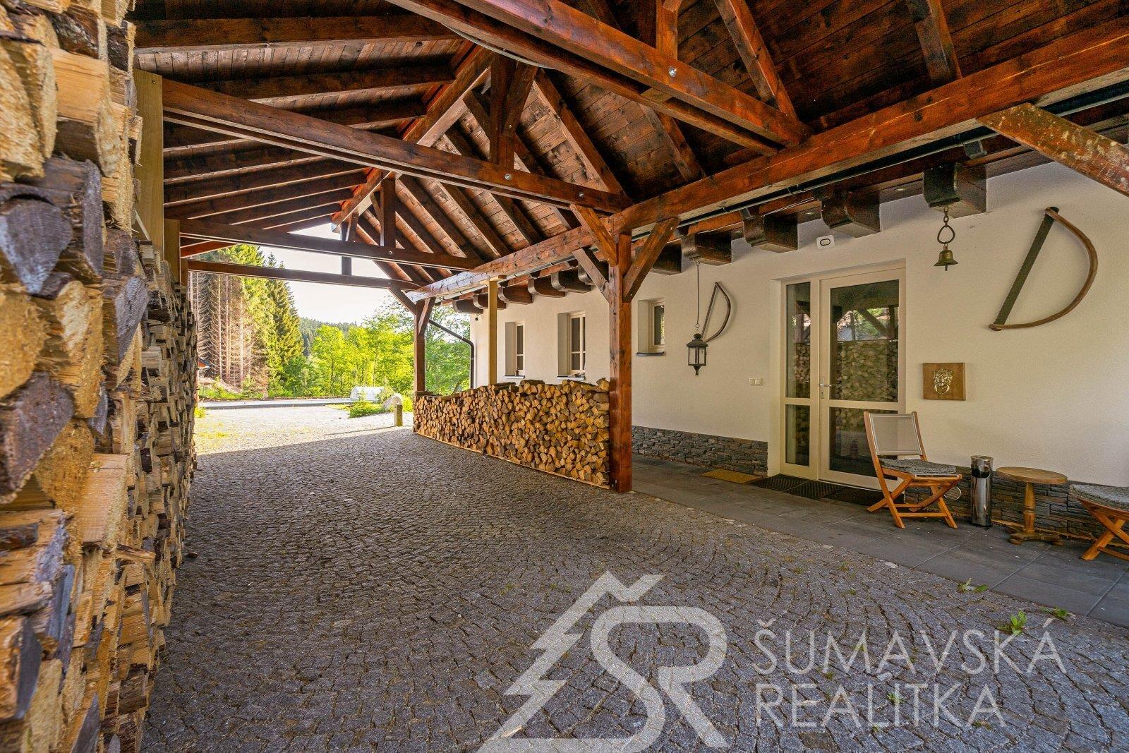 Popis domu: Nadstandardní stylový dům alpského typu, v němž se nachází tři samostatné luxusní bytové jednotky, je novostavbou na obdélníkovém půdorysu  o velikosti  8,0 x 14,0 m. Usazen je v mírném svahu, na krásném, klidném – i v zimě dobře dostupném místě. Exteriér domu přiznává prvky původní šumavské architektury a má velmi příjemné barevné vyladění exteriéru – takže souzní s krajinou a působí přívětivě již při příjezdu. Součástí je i venkovní krytý a zastřešený bazén o rozměrech 8 x 3 x 1,2 m. Dále venkovní finská sauna s posezením v samostatném domku.