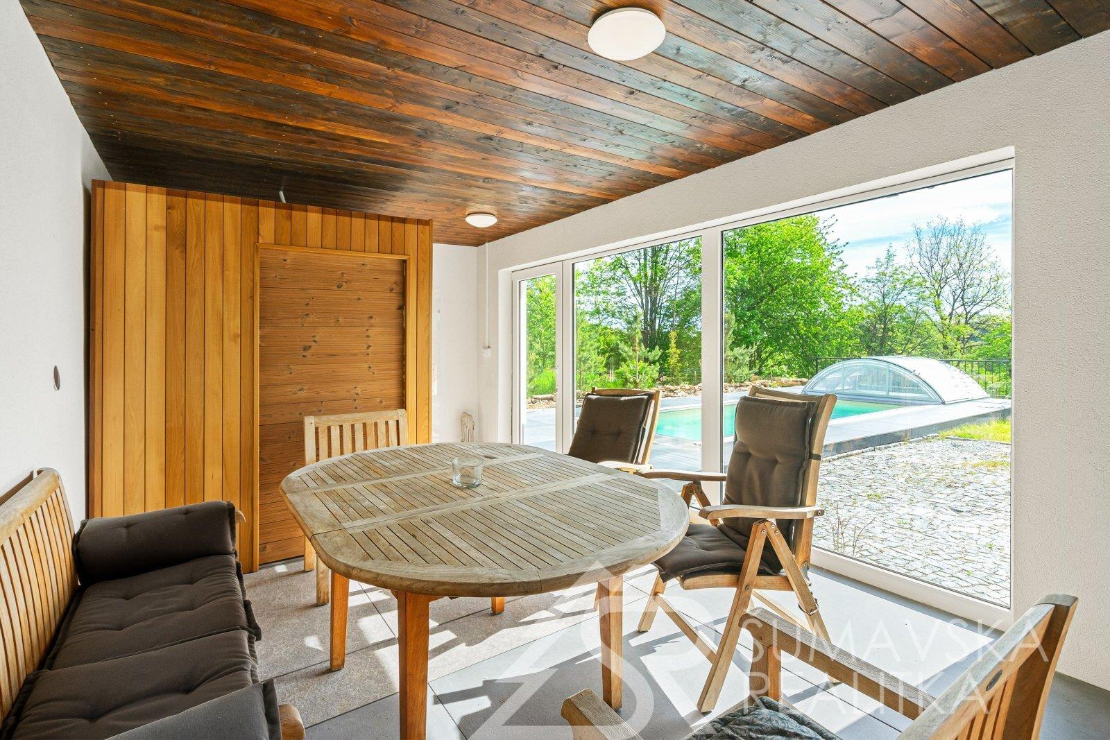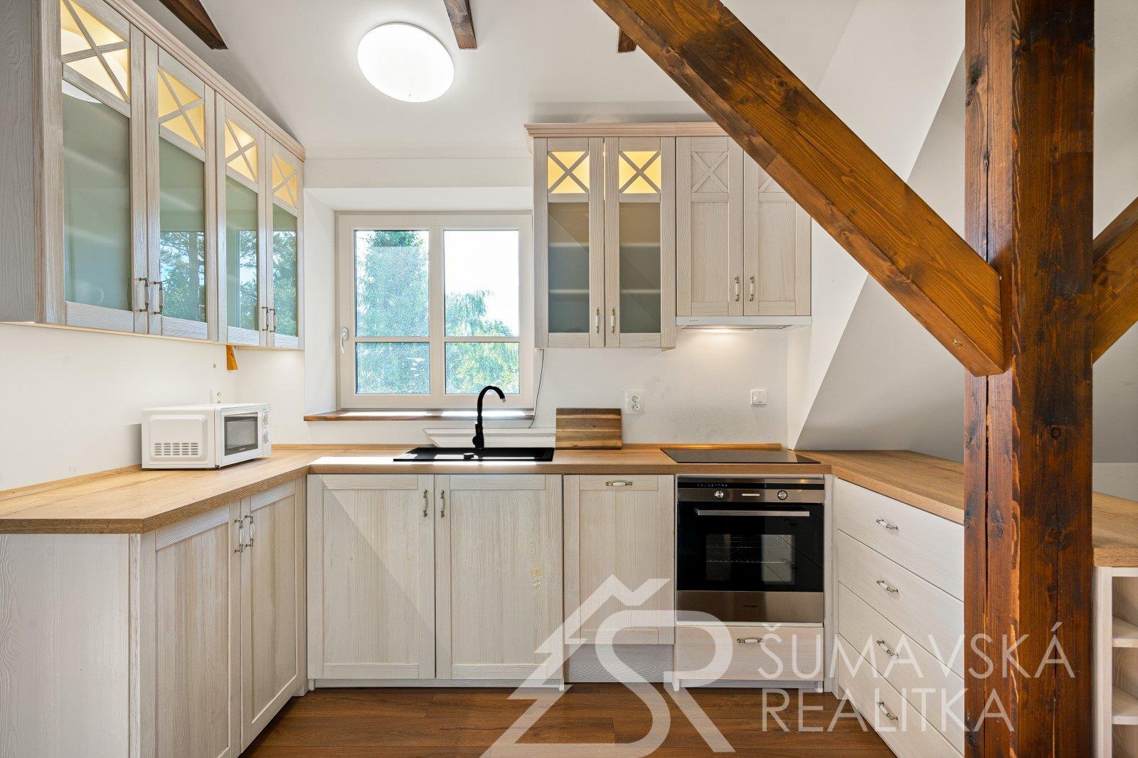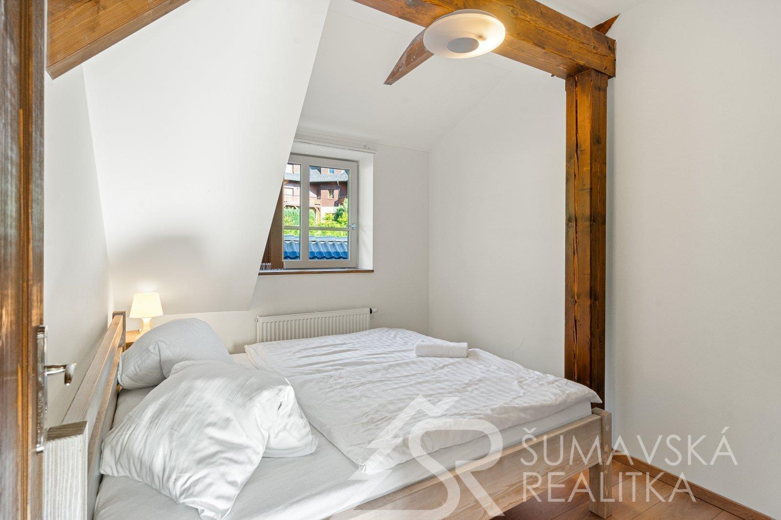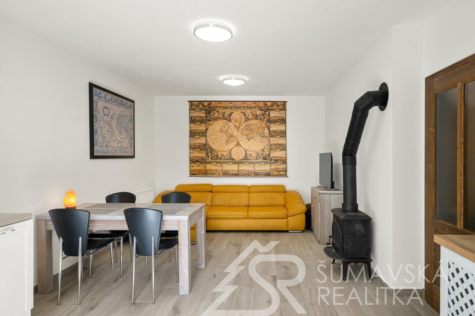 Popis domu: Nadstandardní stylový dům alpského typu, v němž se nachází tři samostatné luxusní bytové jednotky, je novostavbou na obdélníkovém půdorysu  o velikosti  8,0 x 14,0 m. Usazen je v mírném svahu, na krásném, klidném – i v zimě dobře dostupném místě. Exteriér domu přiznává prvky původní šumavské architektury a má velmi příjemné barevné vyladění exteriéru – takže souzní s krajinou a působí přívětivě již při příjezdu. Součástí je i venkovní krytý a zastřešený bazén o rozměrech 8 x 3 x 1,2 m. Dále venkovní finská sauna s posezením v samostatném domku.