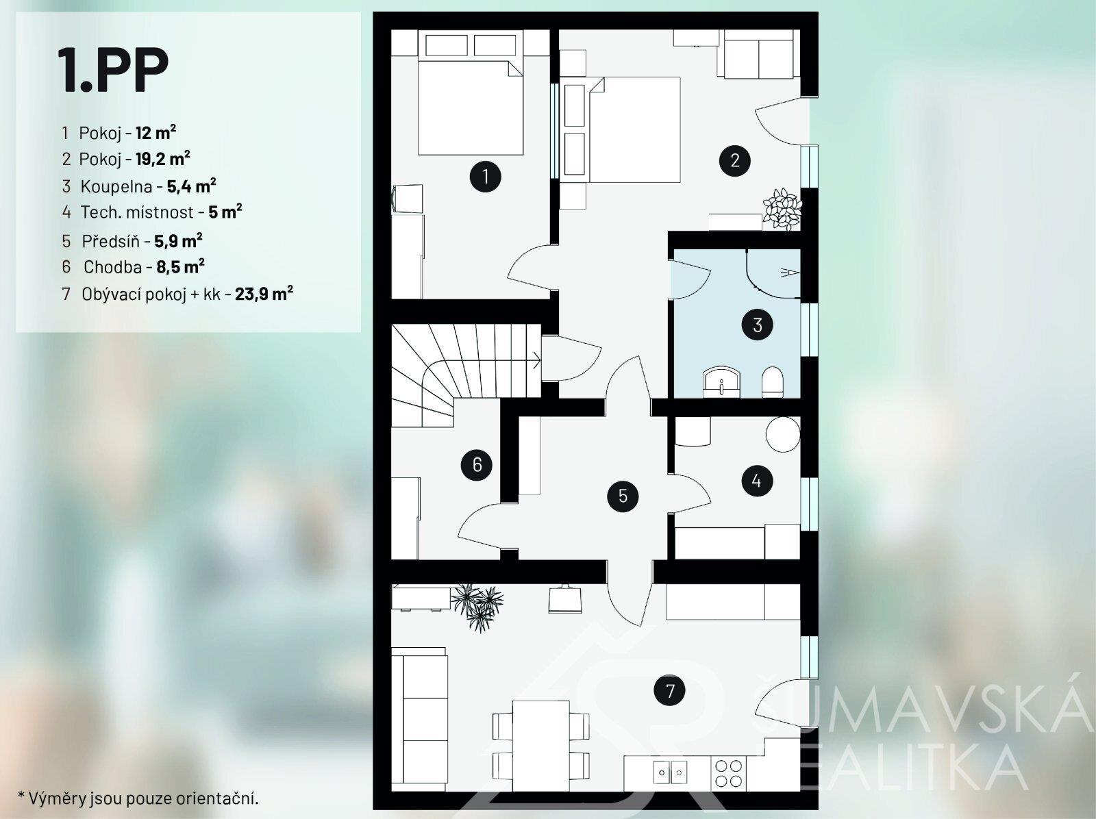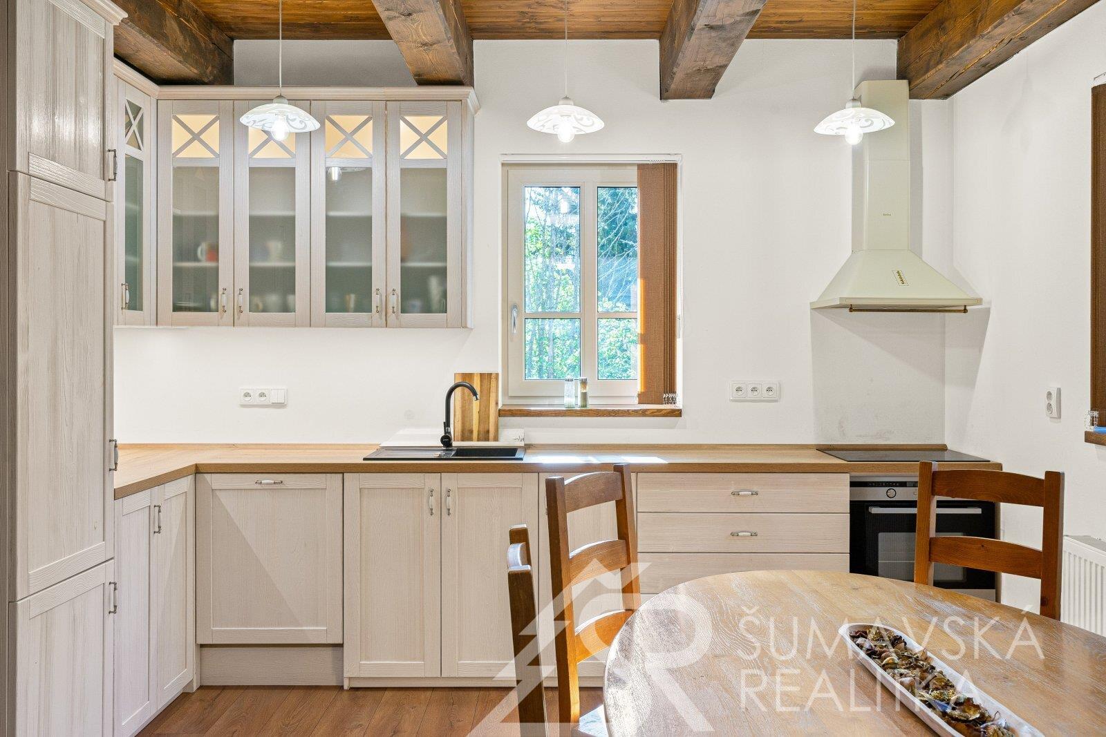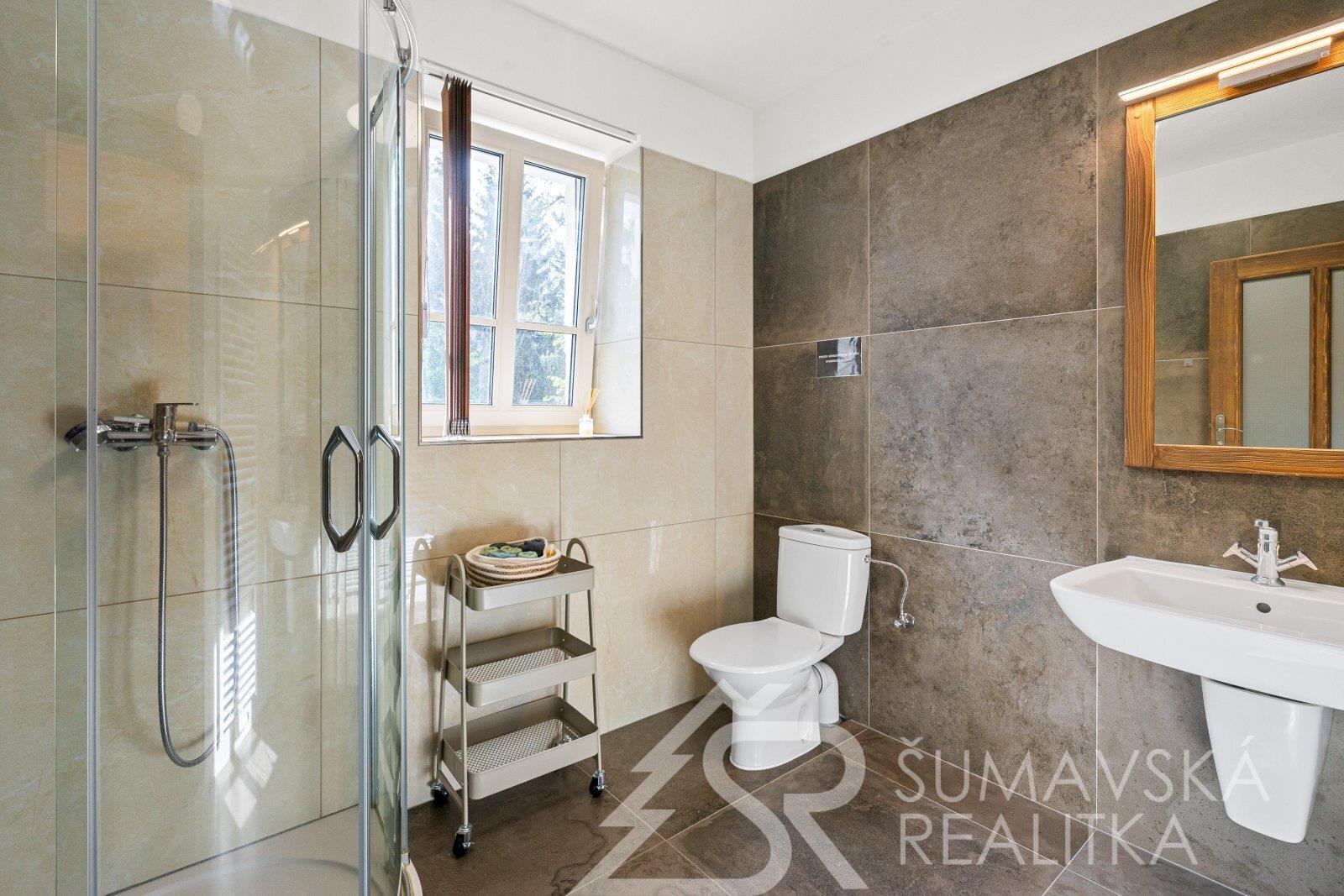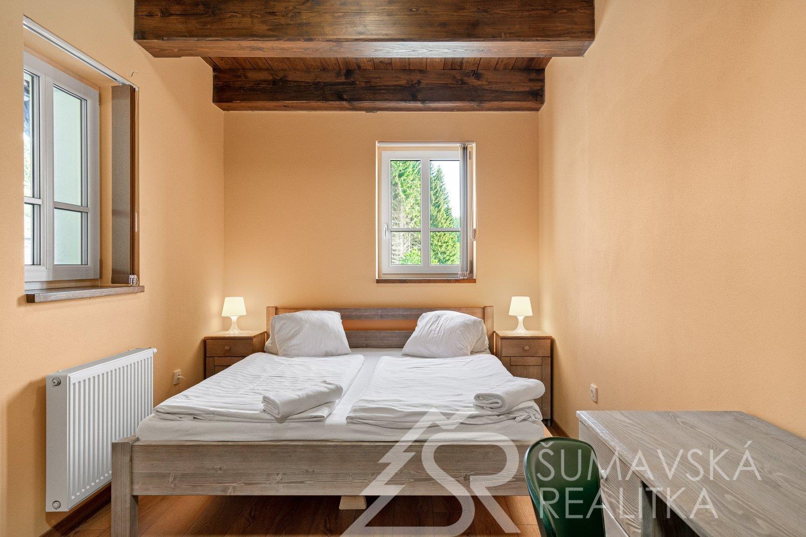 Horský dům o třech samostatných bytových jednotkách byl zkolaudován teprve v roce 2020. Postaven je z poctivých cihelných bloků Porotherm 30Profi se zateplením 200 mm EPS, osazeny jsou okna s trojitým zasklením, čímž bylo dosaženo vynikajících tepelných úspor, což je dokladováno i průkazem energetické náročnosti budovy s výsledkem „B“ ! Dům se nachází ve svahu a díky tomu je umožněn vstup do 1.podzemního podlaží přímo z upraveného terénu a nachází se tam samostatný apartmán o velikosti 80 m2.  V přízemí se nachází další samostatný apartmán o velikosti 87 m2. Ze zádveří vede krásné dřevěné schodiště do patra, kde je umístěn třetí apartmán o velikosti 88 m2. Ten má pohledově přiznaný dřevěný krov a vytváří tím atmosféru šumavské útulné chalupy. Celková užitná plocha domu je tedy 255 m2.  Na vybavení domu byly použity jen ty nejlepší materiály, jako jsou dřevěné plovoucí podlahy, dvoje vnitřní schodiště z dřevěného masivu, vnitřní dřevěné dveře s obložkami, nadčasové obklady v koupelnách apod.