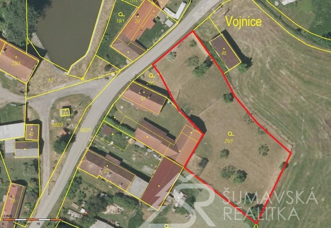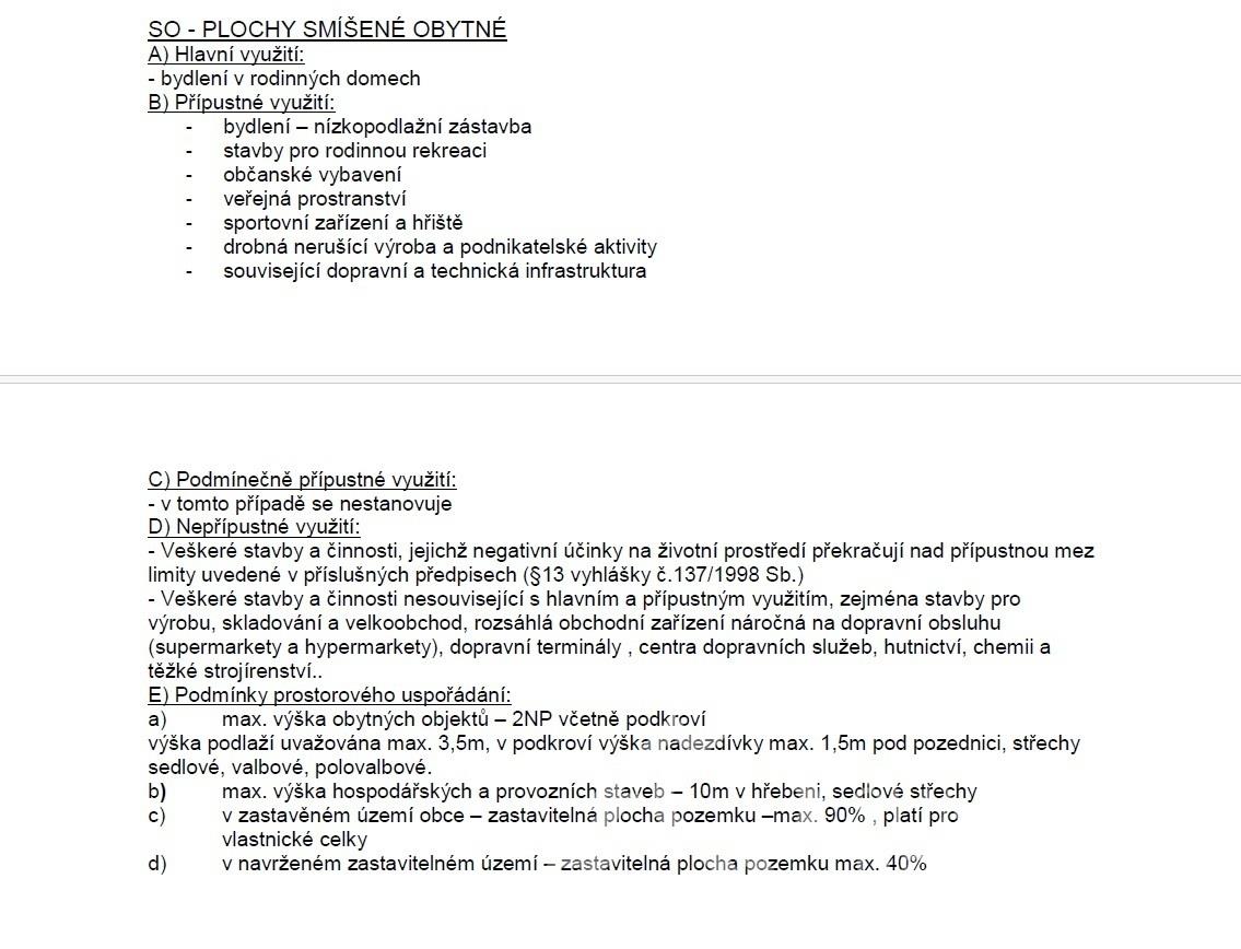 Popis pozemku: v platném územním plánu leží pozemek v „plochách smíšených obytných“, prvotně určených pro bydlení v rodinných domech. Ty zde mohou být dokonce dva! Pro ty je přivedeno i připojení dvou měření od distributora elektřiny E.ON. Z rovinatého pozemku s jižní orientací se otvírá krásný výhled - územní plán už další výstavbu v okolí nepovoluje, tím je zaručen klid, výhled a soukromí. Komunikační napojení je přímé na místní asfaltovou komunikaci. Pozemek je kompletně oplocený a podél komunikace je i kamenná podezdívka s rámovým pletivem do ocelových sloupků. Vodu je možné napojit z obecního vodovodního řadu vedoucí v přilehlé komunikaci. Obec nemá čistírnu odpadních vod, tak je třeba řešit individuálně vlastní ČOV. Elektřina přivedena na pozemek.