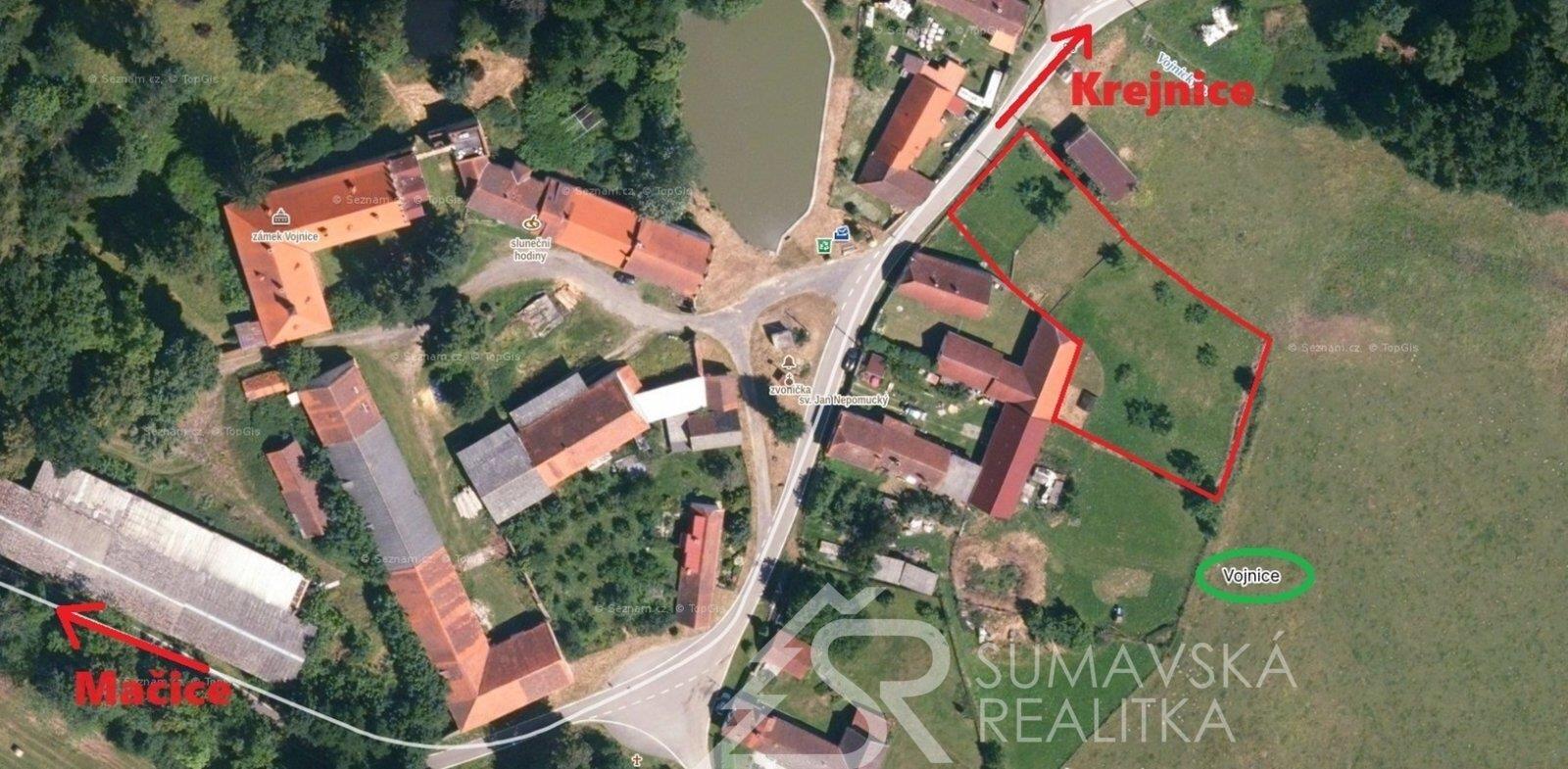 Lokalita: malá vesnička Vojnice v malebné krajině pod Šumavou, ležící v okrese Strakonice (vzdálené 17 km) náleží pod střediskovou obec Volenice. V celkem 34 obydlí je zde hlášeno pouze 14 obyvatel. Na dohled se nachází i nejrozsáhlejší hrad Rabí a stále více oblíbenější šumavské horské středisko Kašperské Hory je vzdálené pouze 18 km. Nad vesničkou stojí a ochraňuje ji nově opravený a bílou barvou svítící kostel Navštívení Panny Marie se zachovalým letopočtem vzniku 1687 (viz fotogalerie). Snad největší zajímavostí a tak trochu záhadou jsou tři dochované barokní zámky ležící v sousedních vesnicích i v samotných Vojnicích. Jejich stavebně technický stav je však přímo úměrný situacím popsaných spisovatelem Evženem Bočkem v knihách o Poslední aristokratce. Ve východně ležících Mačicích se jedná o zámek již ze 14.století, v západně sousedící vesnici Tažovice je barokní zámek s francouzskou zahradou ve stylu Versailles. Ve Vojnicích se z bývalé tvrze barokní přestavbou ze 17.století dochoval zámek, jehož majitelem byl v 19.století i ředitel Škodových závodů v Plzni pan František Wellner. To jistě svědčí o oblibě tohoto kraje. Atraktivní je i pro příznivce motorismu – startuje zde i etapa rychlostní zkoušky Rallye Šumava: Vojnice – Hoslovice. Časté zatáčky, mírná stoupání i prudká klesání vyhovuje i cyklistům, kteří si zde užívají jízdu na velmi kvalitním asfaltu, kterým je Jihočeský kraj známý.